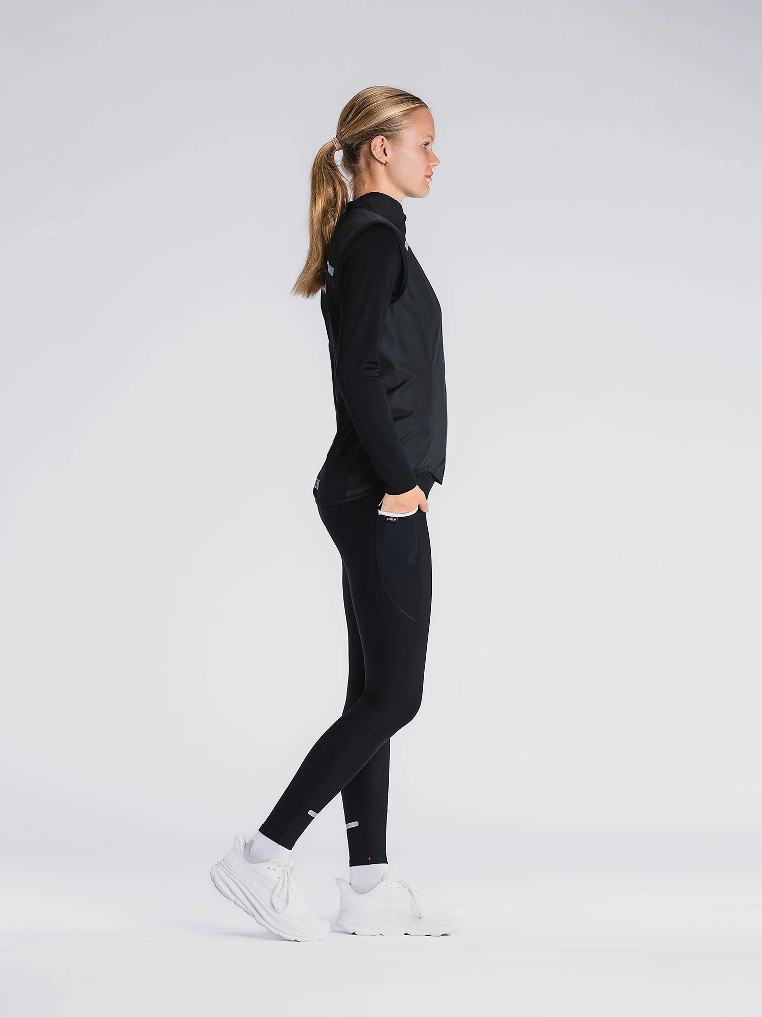 Discrete maar veilige 3M-reflecterende transfers op het sleutelbeen en de rug zorgen voor 360 graden zichtbaarheid tijdens de donkere uren. Kies indien gewenst het vest in Hi-Vis voor meer veiligheid.